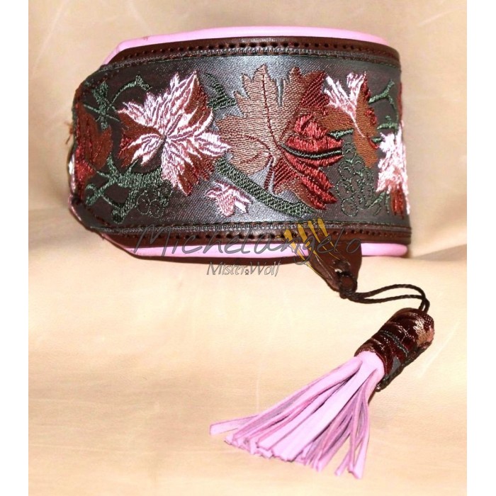 Collare in cuoio per Borzoi, imbottito e rivestito in morbida pelle. Nappina e tessuto damascato. Fibbia.