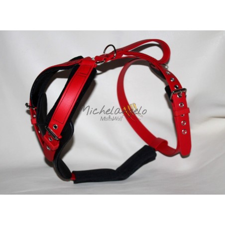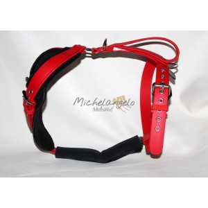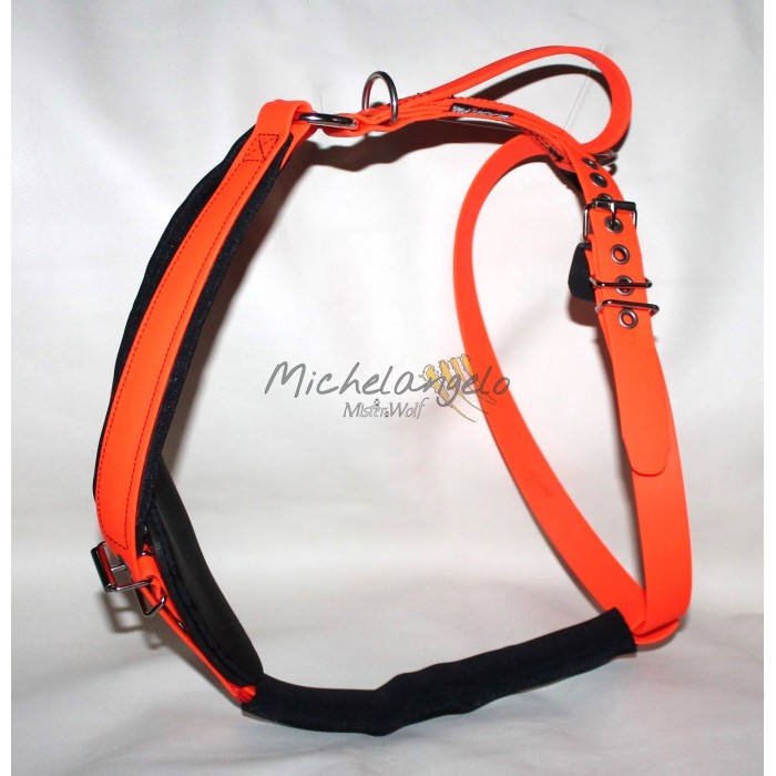Colore Biothane rosso, arancione alta visibilità, nero, nero e fuxia, marrone, giallo neon e nero (come foto). Pettorale sagomato nero.