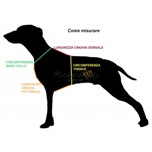 circonferenza base collo; circonferenza torace; lunghezza cinghia dorsale; lunhezza cinghia pettorale