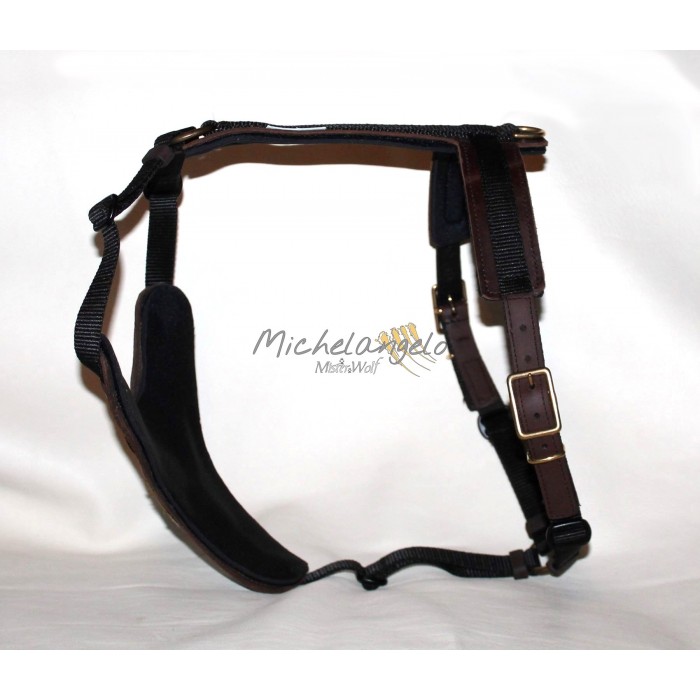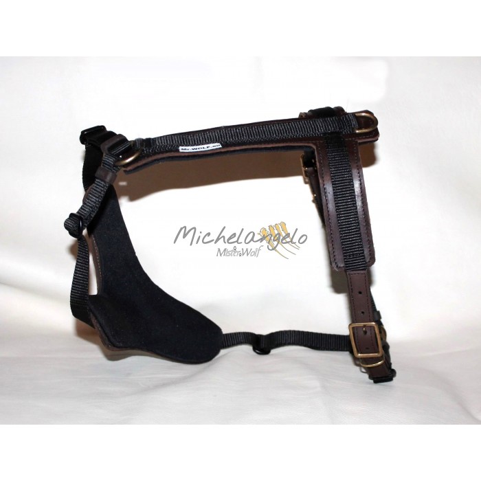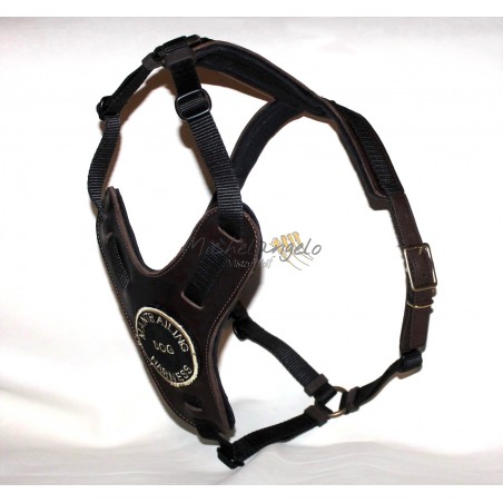 La pettorina è realizzata in nylon (larghezza fettuccia nylon cm 2), la fibbieria è in ottone massiccio.