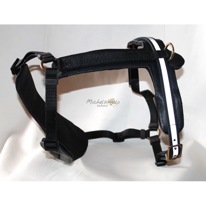 Rinforzi in biothane riflettente su tutta la cinghia torace e sulla chiusura delle fibbie.