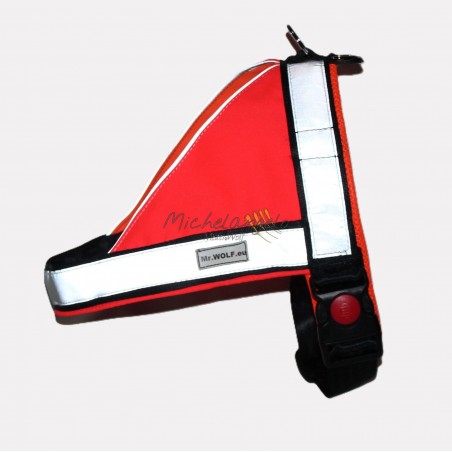 La fascia sul petto e quella sulle spalle è provvista di banda catarinfrangente, riflettente.