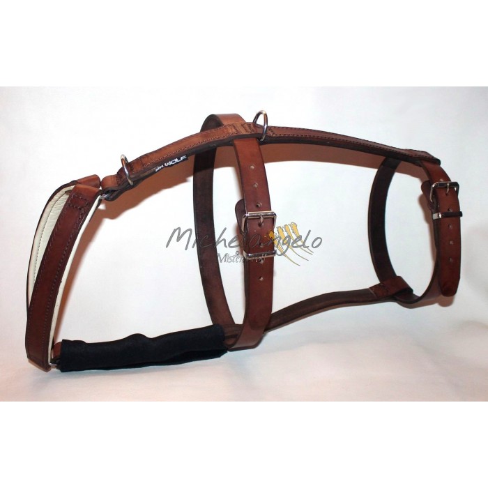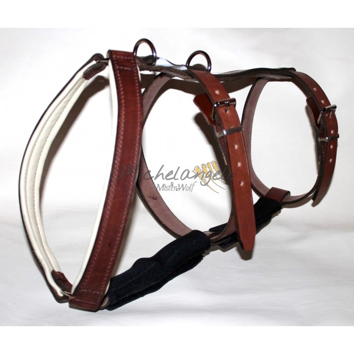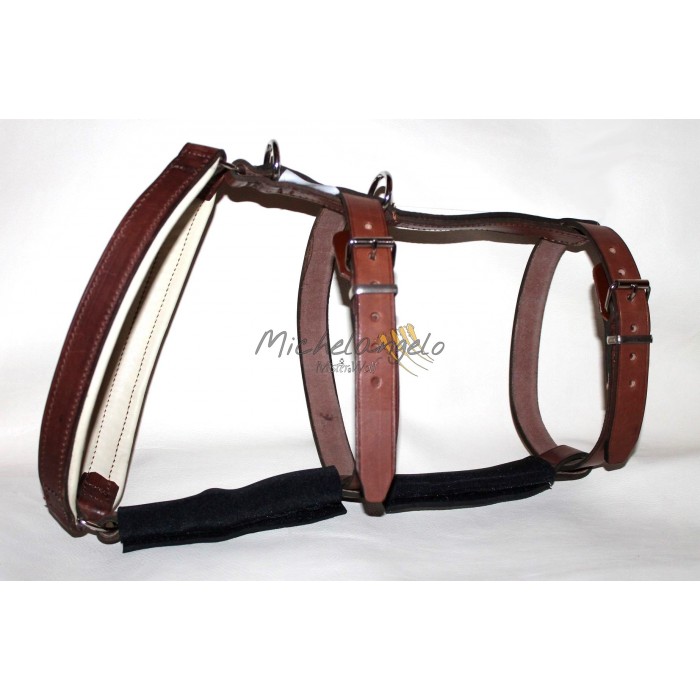 Vero cuoio resistente alla trazione. La forma della pettorina evita lo sfregamento nella zona delle ascelle.