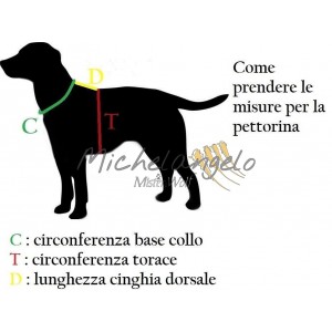 Per controllare la misurazione (se il tuo cane rientra nelle misure per la taglia M) guarda come prendere le misure richieste nel disegno alla fine delle fotografie della pettorina: