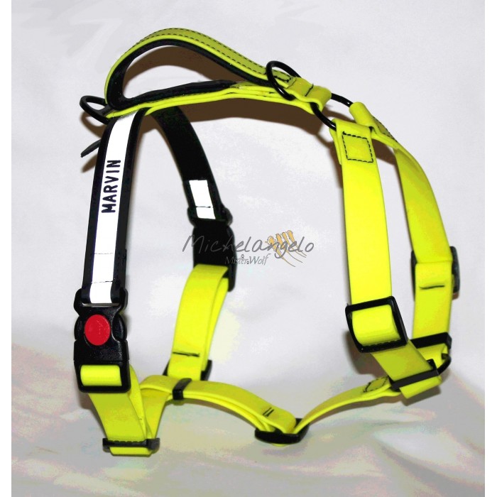 Pettorina ad H  in Biothane con nome e numero di telefono incisi su inserti riflettenti laterali.